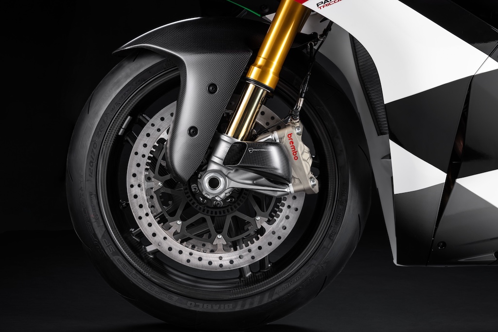Kẹp phanh được anode màu titan và logo Brembo cỡ lớn. Cuối cùng, cùm phanh trước là Brembo MCS 19.21 với chức năng điều chỉnh vị trí tay phanh từ xa, giống như trên MotoGP và Superbike. Trang bị đặc biệt của Tricolore được hoàn thiện bằng bộ ly hợp khô, gác chân có thể điều chỉnh bằng nhôm nguyên khối và mô-đun GPS.