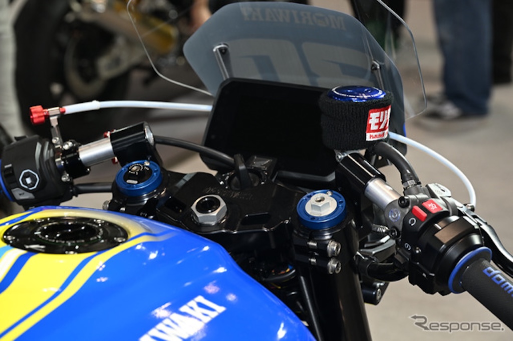Bản thân khu vực tay lái của chiếc xe cũng được thay bằng ghi-đông clip-on để có tư thế ngồi chúi người hơn, được gắn vào chảng ba trên nhôm CNC do Moriwaki chế tạo. Moriwaki cũng lắp cùm núm vặn điều chỉnh nhanh tay phanh ở bên trái CB1000F và cùm ga cuốn Domino. Để tiếp nhiên liệu nhanh, nắp xăng nguyên bản với khoá đã được thay bằng nắp nhôm Valter Moto.