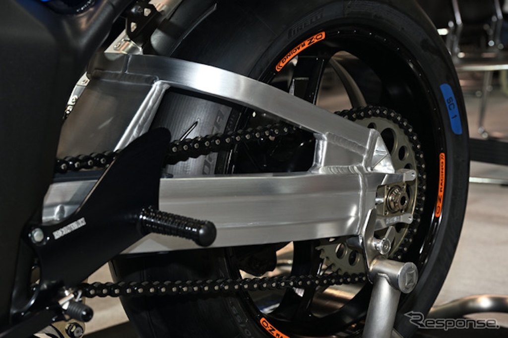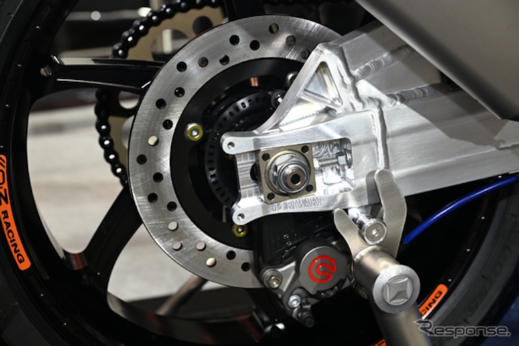 Ở phía sau, hệ thống phanh cũng được nâng cấp với heo Brembo P2 34 2 piston đối xứng gắn vào gắp qua pad CNC anode đen. Đáng chú ý, Moriwaki cũng thay gắp nguyên bản bằng bộ gắp nhôm nhẹ nhưng chắc hơn do hãng thiết kế. Gắp này nối với khung qua phuộc Moriwaki x Nitron. Cuối cùng xét tới mục đích sử dụng trong trường đua của xe, Moriwaki cũng thay cặp lốp Pirelli Diablo Supercorsa SC1 cho chiếc siêu naked bike hoài cổ sắp mở bán của nhà Honda.