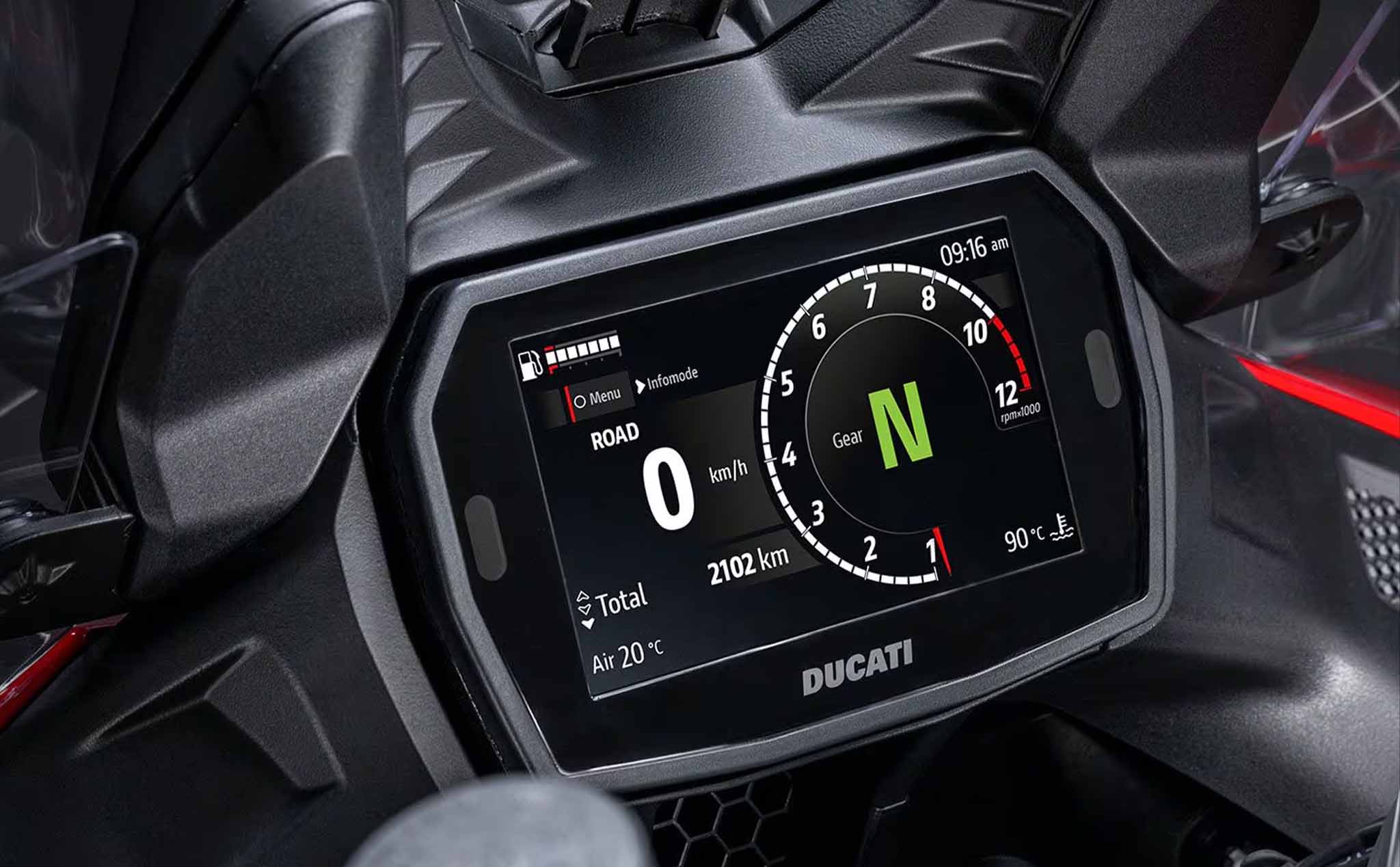 Ducati Multistrada V2 mang lại không gian rộng rãi cho hai người nhờ vào chiều dài cơ sở 1.572mm và yên xe đôi. Phần ốp đầu xe được thiết kế mạnh mẽ, không chỉ tăng thêm vẻ cá tính mà còn đảm bảo khả năng chắn gió tốt ở tốc độ cao nhờ kính chắn gió có thể điều chỉnh.