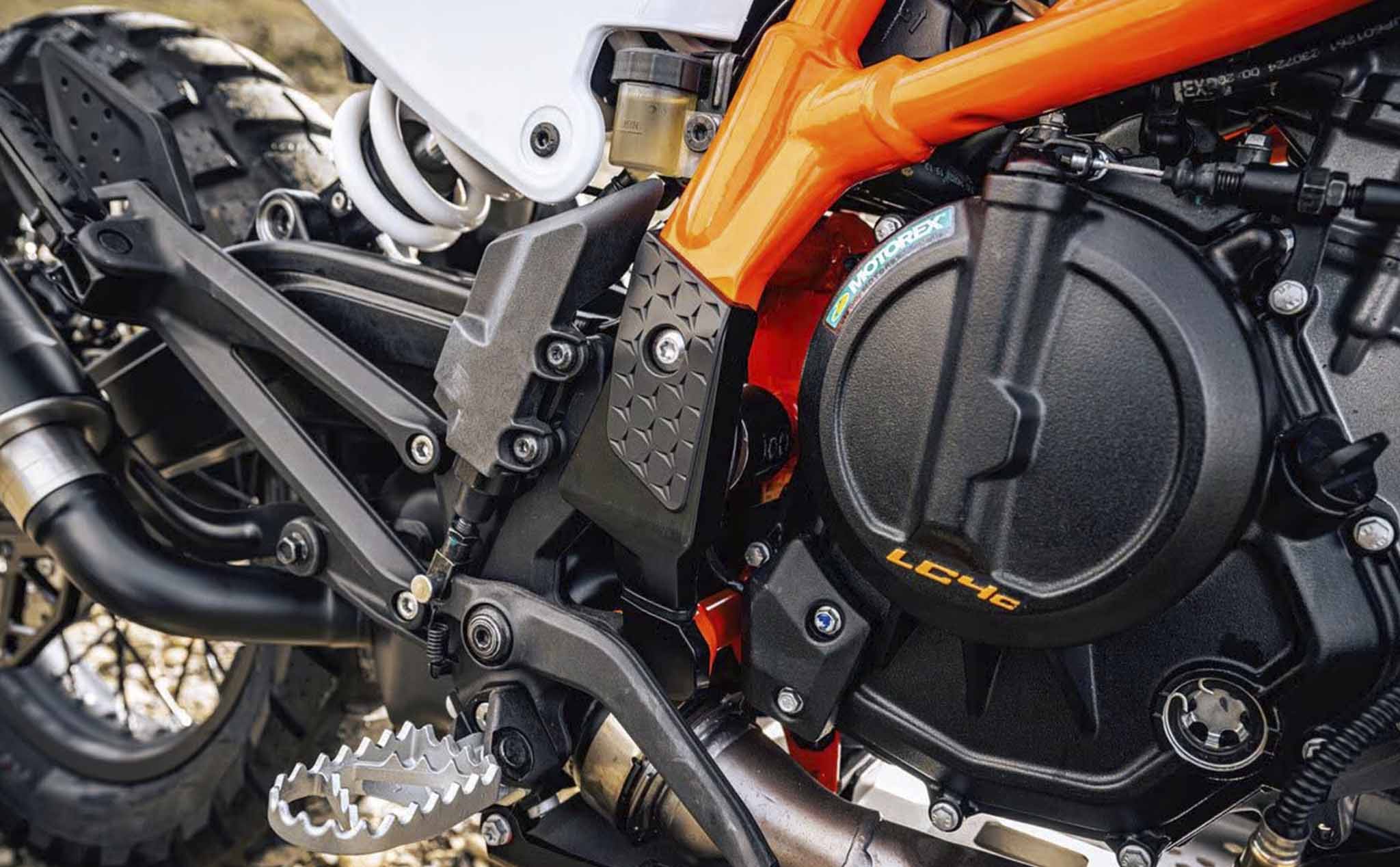 Ngoài ra, khoảng trống giữa két nước và bánh trước được tăng lên để phù hợp với mâm 21 inch. Khung phụ dạng bắt vít cũng xuất hiện trên 390 Enduro R, một trang bị hữu ích cho xe off-road. Yên xe dạng phẳng một mảnh giúp người lái có tư thế điều khiển đặc trưng của dòng dual-sport, trong khi bộ gác chân được bố trí lại nhằm tối ưu trải nghiệm khi chạy trên địa hình gồ ghề.