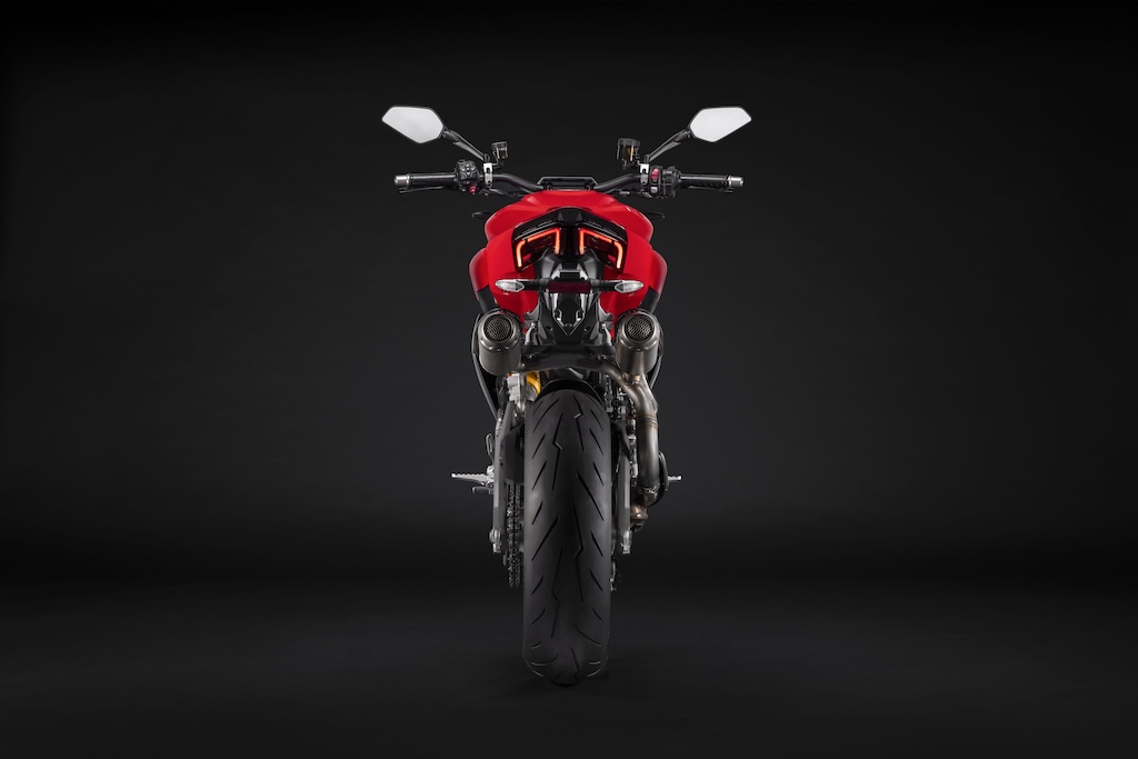 Về mặt thị giác, điều này giữ được tính thẩm mỹ liền mạch từ đèn pha đến bình xăng, đến yên xe và đuôi xe. Đèn hậu full-LED được chia đôi, mặc dù điểm thu hút sự chú ý chính ở phía sau xe là sự trở lại của ống xả kép dưới đuôi. Ducati cho biết chúng là sự tôn vinh quá khứ siêu mô tô của Ducati. Có lẽ hãng đã quên hoặc phớt lờ việc giới truyền thông mô tô (và có thể là cả khách hàng nói chung) ghét ống xả dưới đuôi trước đây như thế nào vì chúng quá nóng, đặc biệt là ở tốc độ chậm và trọng lượng cao hơn các giải pháp bố trí khác.