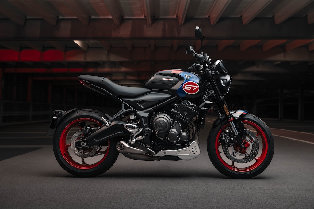 Chiếc Trident Triple Tribute năm 2024 có sự khác biệt nhờ thiết kế có nhiều chi tiết màu trắng, tuy nhiên cả hai phiên bản đều có số 67 - giống với số của xe đua Slippery Sam ban đầu. Đối với năm 2025, bộ vành 17 inch tiêu chuẩn có màu đỏ đậm để phù hợp với bảng số nêu trên. Do dựa trên cơ sở Trident 660 2025, nó đã có giảm xóc 'piston lớn' SFF-BF của Showa. Trident 660 hiện sở hữu công nghệ hàng đầu phân khúc.