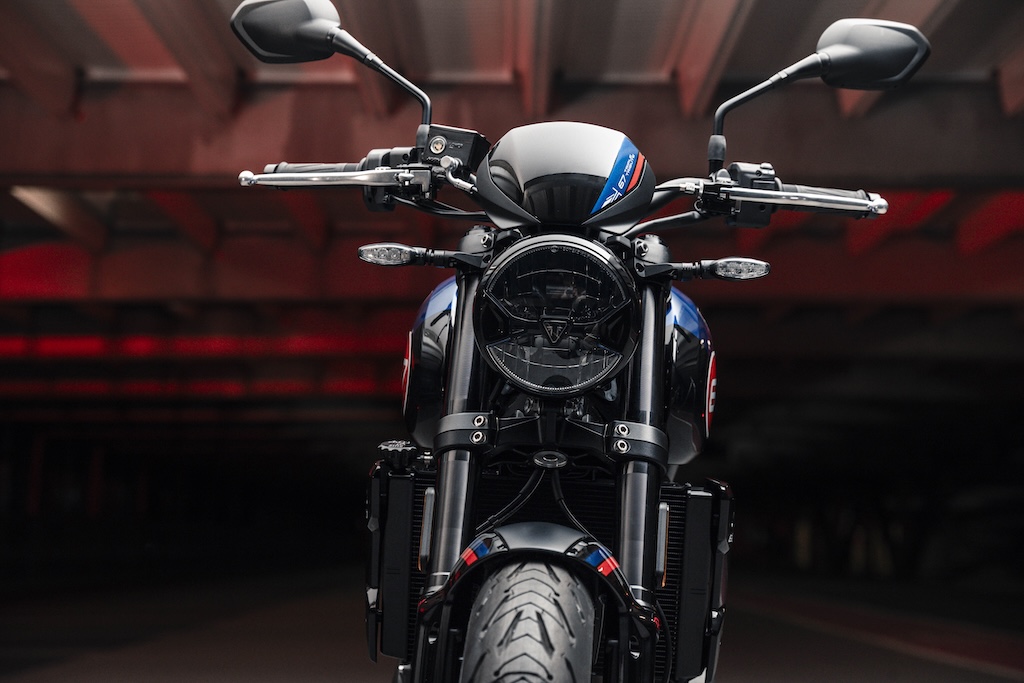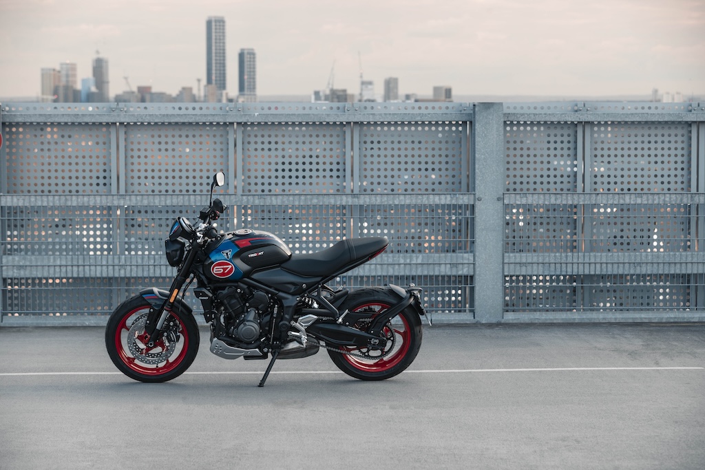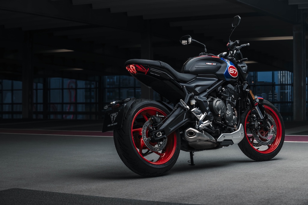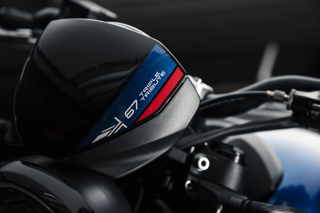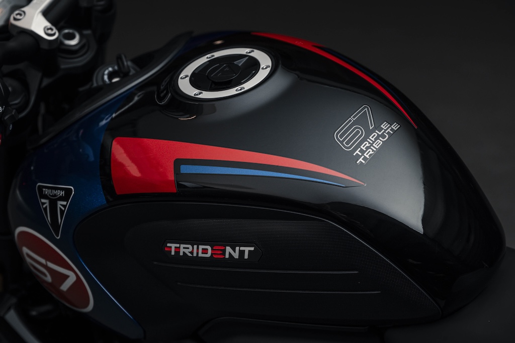 Phiên bản đặc biệt này có tông màu xanh, đen và đỏ mới – hoàn thiện với mào chắn gió cùng tông màu và ốp gầm màu nhôm bạc. Sau đó là ốp tản nhiệt cùng màu thân xe, chảng ba màu nhôm và bảo vệ gót chân, cùng với bộ bảo vệ phuộc cùng màu thân xe. Trident Triple Tribute vẫn giữ nguyên chiều cao yên xe 805mm dễ chống chân như tiêu chuẩn và nặng 189kg khi sẵn sàng lái.