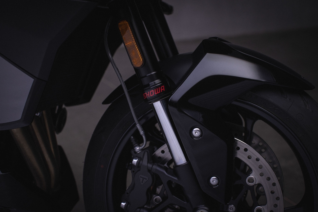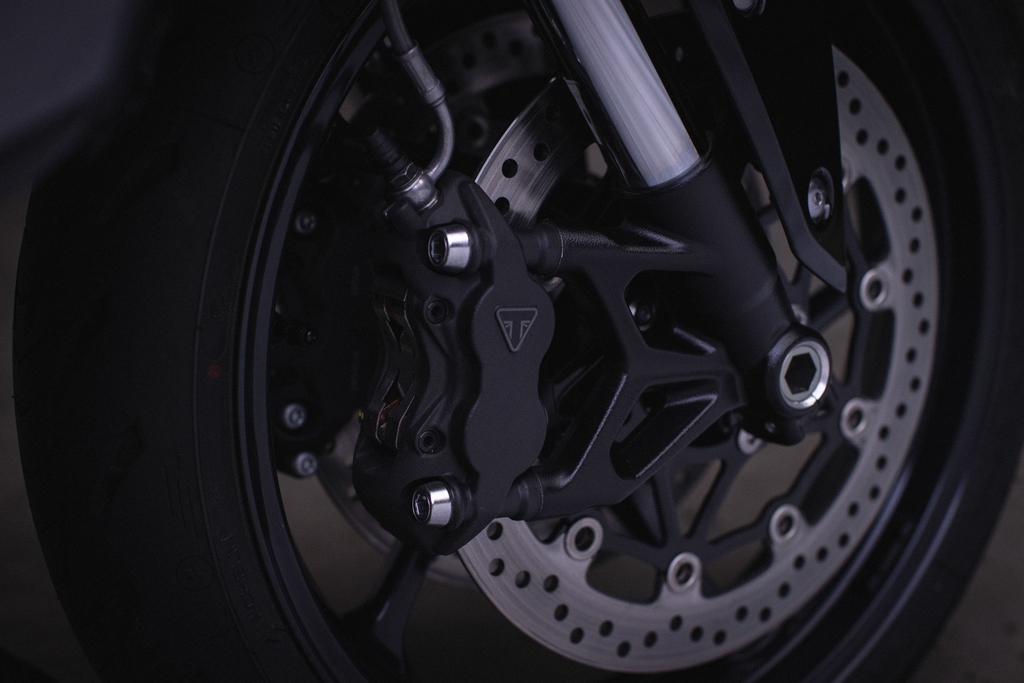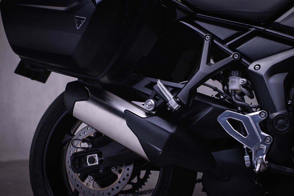 Hệ thống ống xả lớn, nằm bên hông, thay vì thiết kế đặt dưới bụng như trên phiên bản 660, là một trong những chi tiết dễ nhận diện nhất của Tiger Sport 800. Ngoài ra, xe còn có cụm đèn ban ngày mới, đặt ngay trên lưới tản nhiệt phía trước, cùng các tấm chắn gió trong suốt hai bên. Bộ tản nhiệt của xe cũng lớn hơn và có thêm ốp bảo vệ động cơ phía dưới. Đặc biệt, bộ kẹp phanh 4 piston gắn hướng tâm “cây nhà lá vườn” thay thế cho kẹp phanh Nissin gắn theo hướng trục của phiên bản 660, cùng với đó là phuộc trước Showa 41mm mới có khả năng điều chỉnh độ nén và độ hồi.