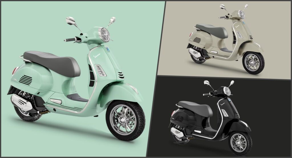 Vespa GTS 310 2025 có 3 phiên bản riêng. GTS cổ điển có các tông màu Beige Avvolgente, Nero Convinto và Verde Amabile, kết hợp với lớp mạ crôm thời trang, ôm sát thân xe cùng huy hiệu “cà vạt” đặc trưng, lò xo phuộc trước, viền đèn pha, miệng ống xả.