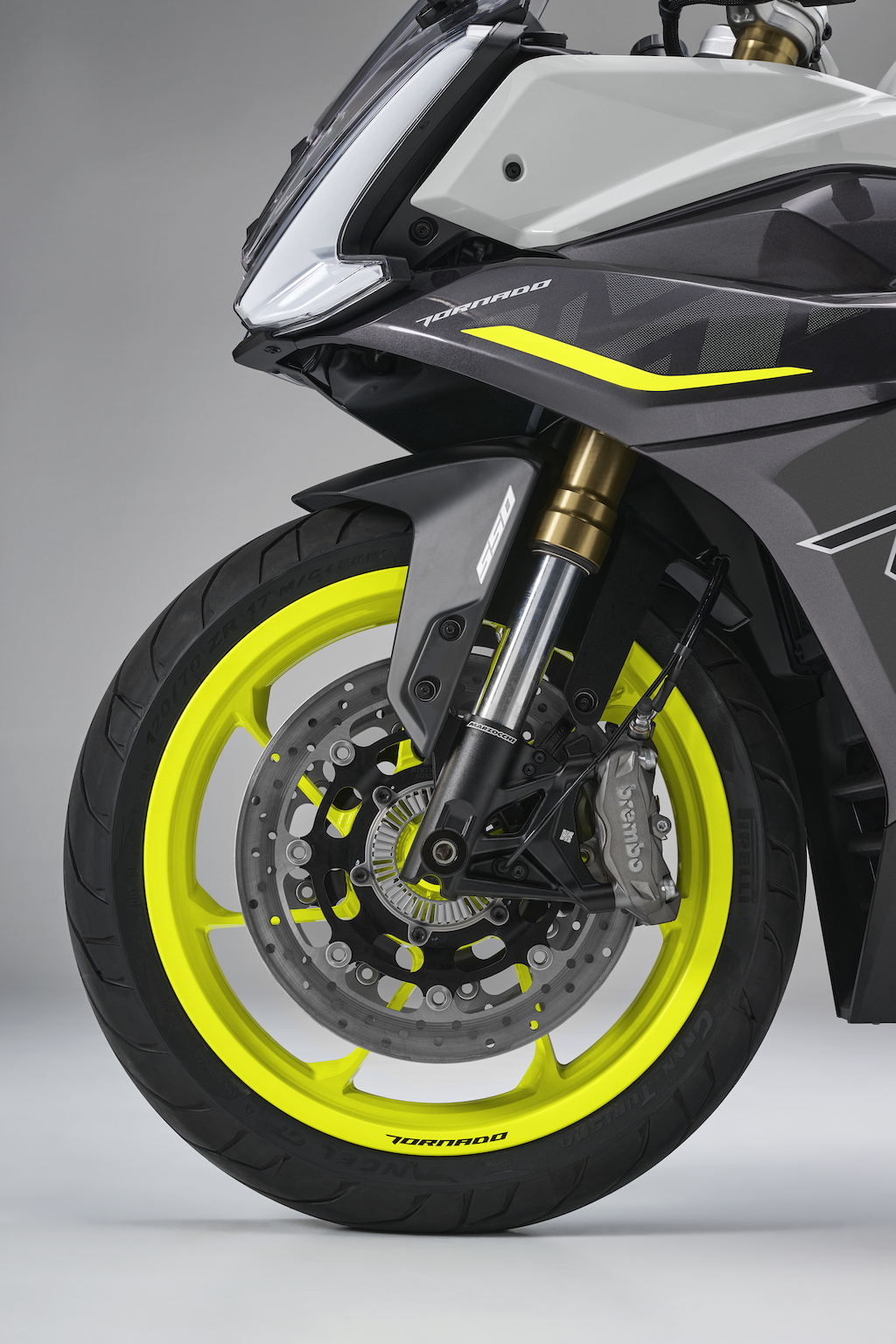 Xe cũng dùng chung khung lưới dạng ống, trong khi ở phía trước có phuộc Marzocchi có thể điều chỉnh hoàn toàn với đường kính ti trong 41mm và hành trình 115mm. Các trang bị tiêu chuẩn của Tornado 550 gồm màn hình màu TFT 5 inch được trang bị kết nối Bluetooth. Hơn nữa, bằng cách kết nối qua wi-fi, người dùng có thể biến bảng đồng hồ xe máy của mình thành thiết bị định vị.