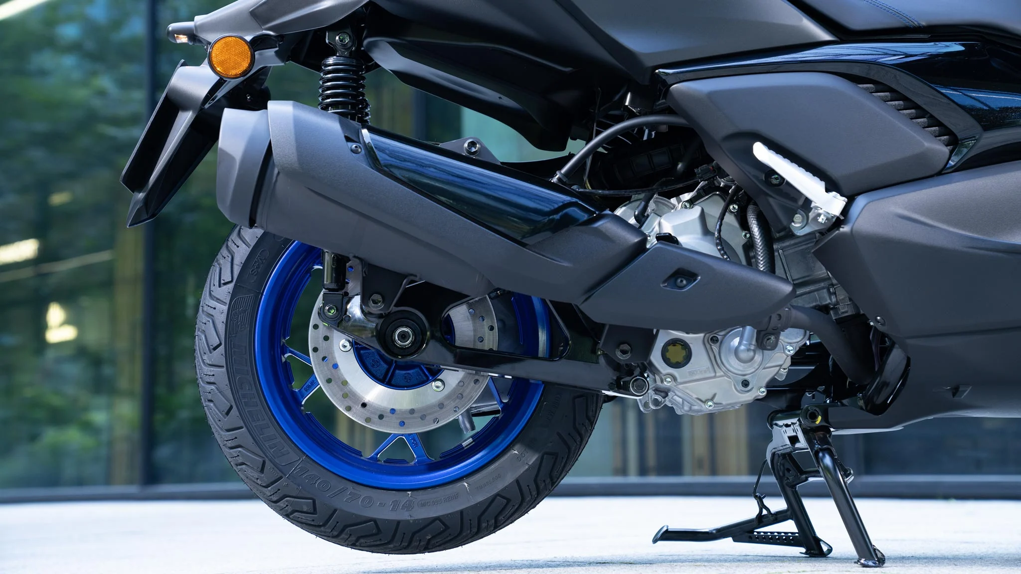Về ngoại hình, Yamaha XMAX 300 2025 không khác biệt nhiều so với mẫu xe năm ngoái. Điểm dễ nhận thấy nhất là thiết kế ống xả mới, dài hơn và gọn nhẹ hơn so với thiết kế tiền nhiệm. Yamaha cho biết sự thay đổi này giúp giảm trọng lượng và cải thiện việc phân bổ trọng tâm. Ngoài ra, gắp sau cũng được thiết kế lại để phù hợp với hệ thống pô mới.